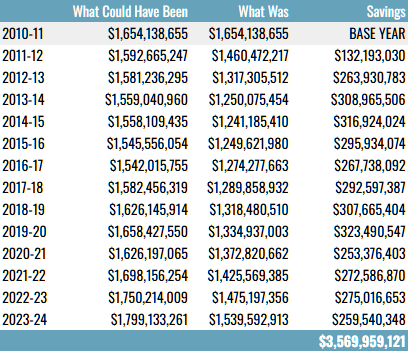 No method of analysis is perfect. As stated before, we’ll never know what would have transpired had PA 152 not been adopted in 2011. Behavior would have changed at some point and to some degree. As district budgets were being devoured by rising insurance costs, administrators would have taken firm stands at the bargaining table to preserve dollars for other areas of the budget. Employee groups also would have eventually sought alternative plans as raises dwindled and layoffs became more common. But just because we can’t prove its exact dollar value, it doesn’t mean that we should disregard the impact the legislation has had.