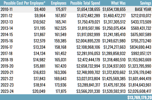 *This table starts with the actual cost per employee for insurance expenditures in 2010-11 ($9,400) and extrapolates that figure forward to arrive at total costs based on actual employment each year.